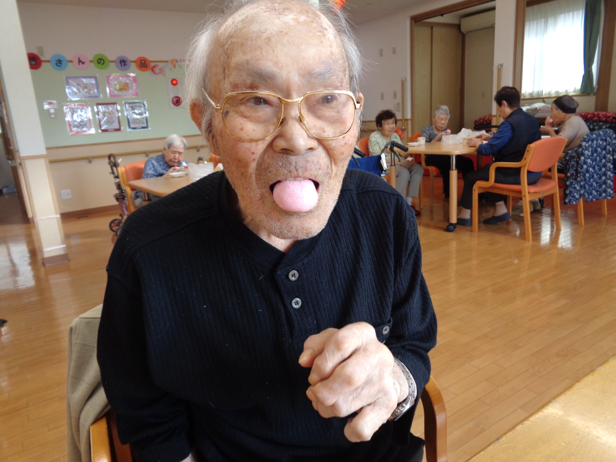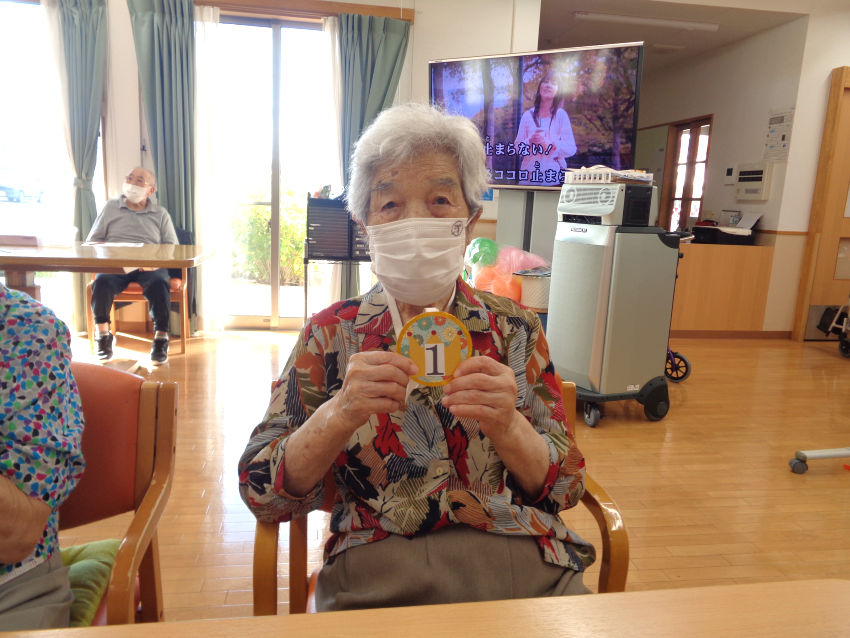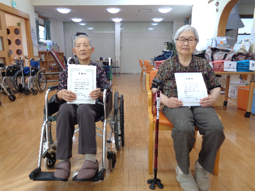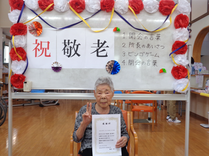 今年は、白寿1名と米寿2名の方に賞状の贈呈と利用者様全員に温湿度計をプレゼントしました。特製のメダル付きビンゴゲームやおやつに紅白まんじゅうを食べて、日頃の皆様への感謝と長寿をお祝いしました。