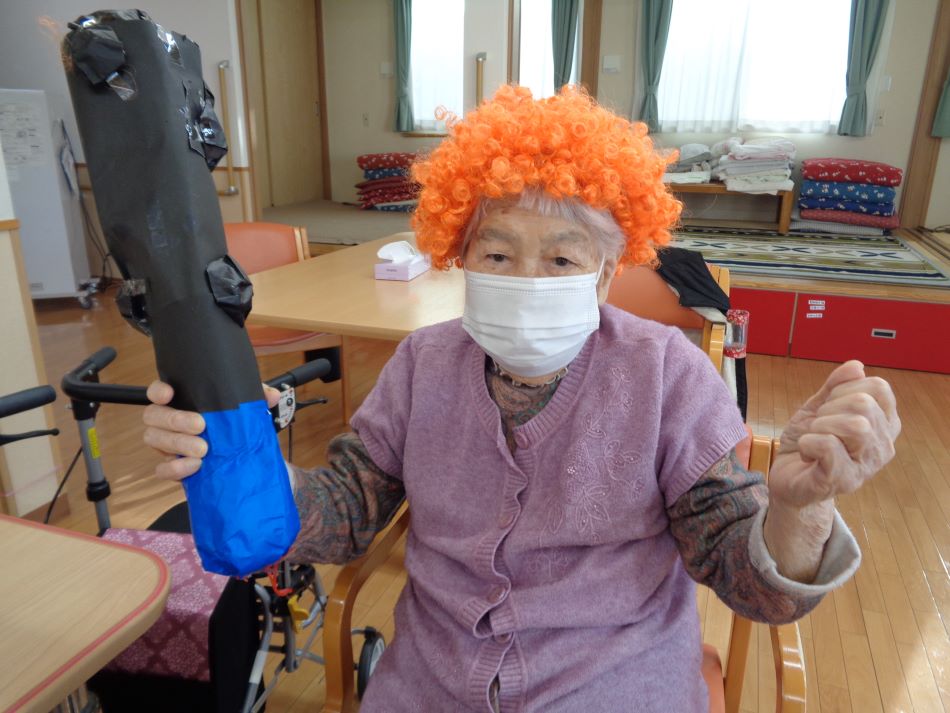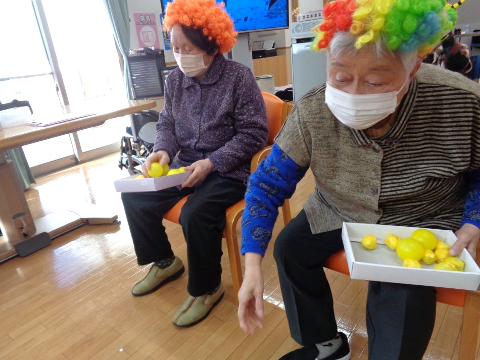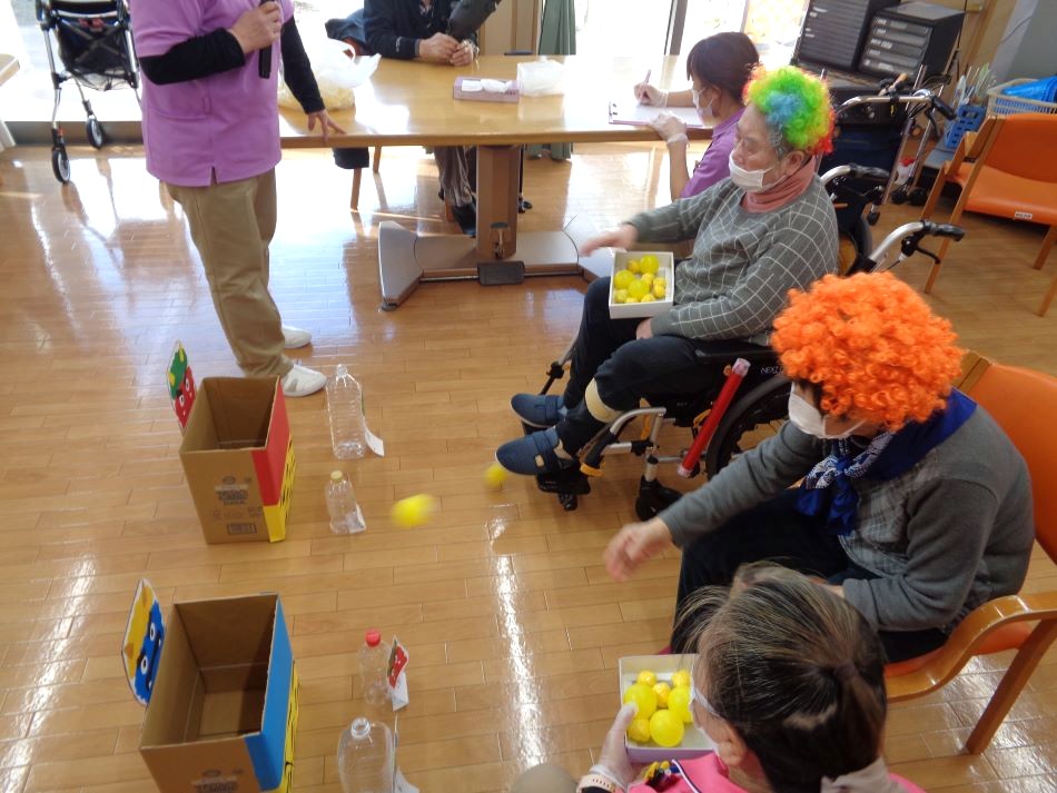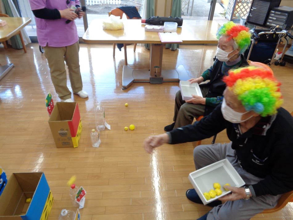 2月3日「鬼退治ゲーム」を行いました。「鬼は外!」、「福は内!」と掛け声をされながら夢中に的を狙いすましていました!皆様、季節を感じながら楽しく身体を動かす事ができ、和やかな時間を過ごされました。