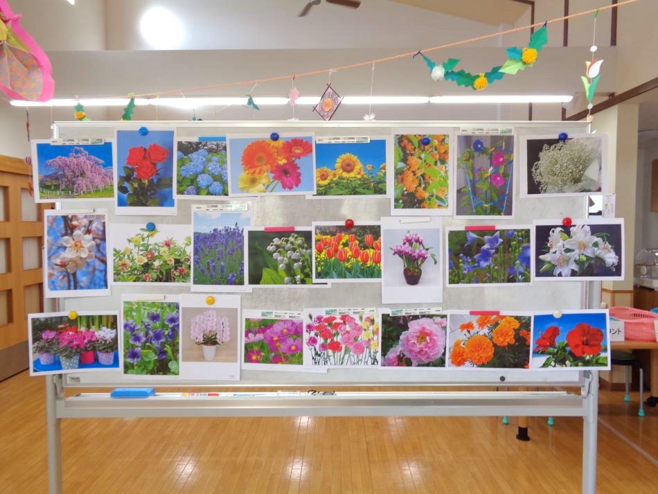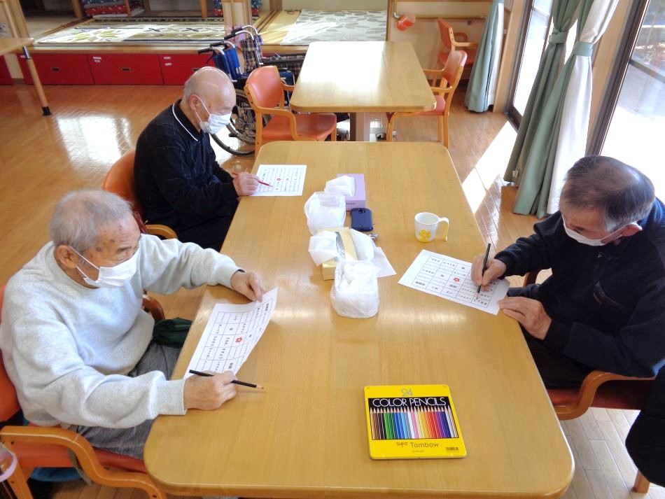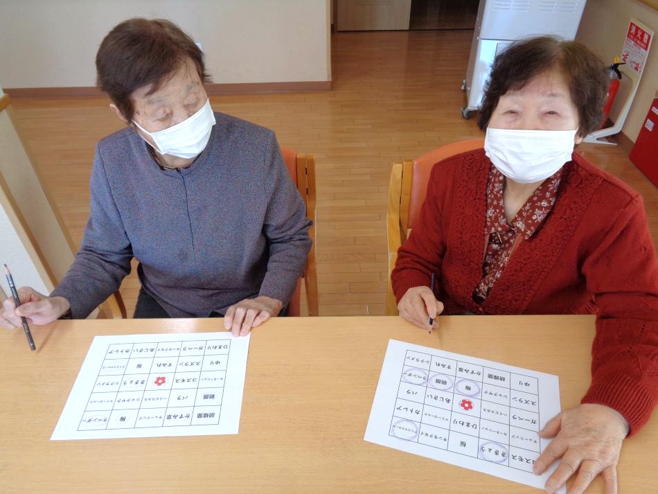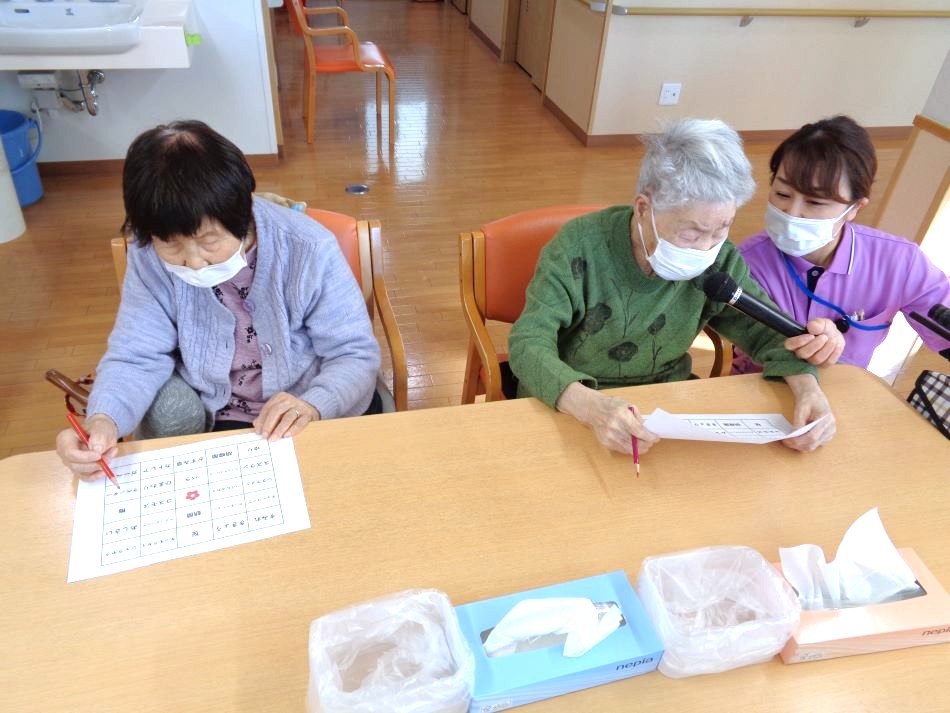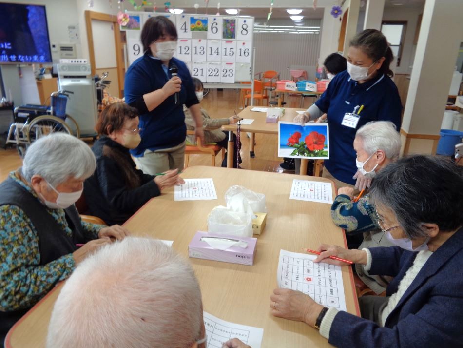 春にちなんだ花が描かれているカードを1つ選んでもらい、そのカードに描かれている花を利用者様に答えてもらいました。皆様、即座に答えを述べられ、いち早くビンゴできるよう真剣な眼差しで参加され、楽しいひと時を過ごされました!