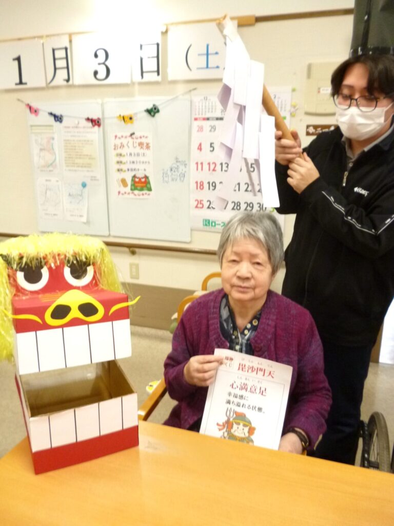 職員お手製の神社でお参りをされたり、七福神おみくじを引いて運勢を占ったりされ楽しまれました。