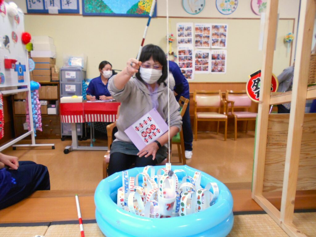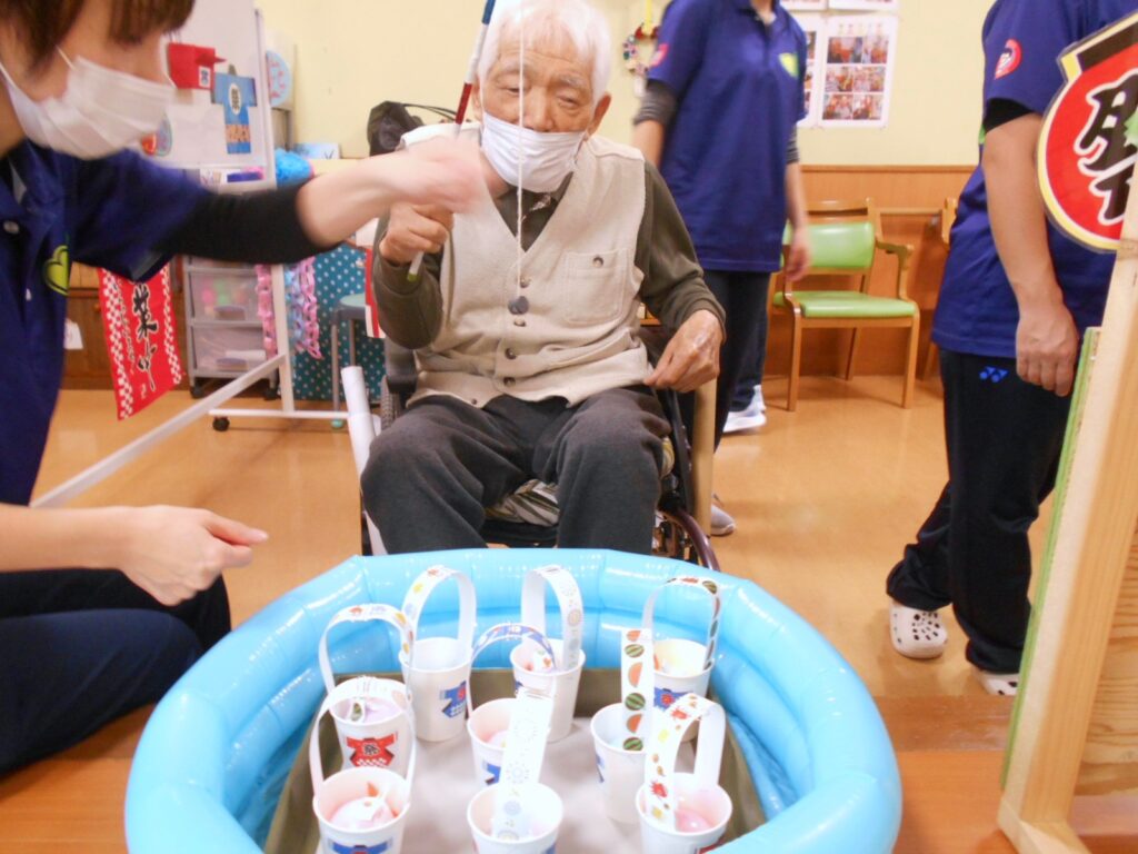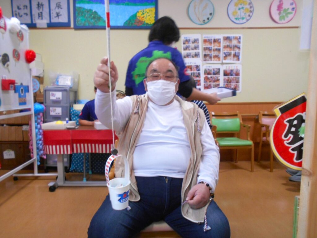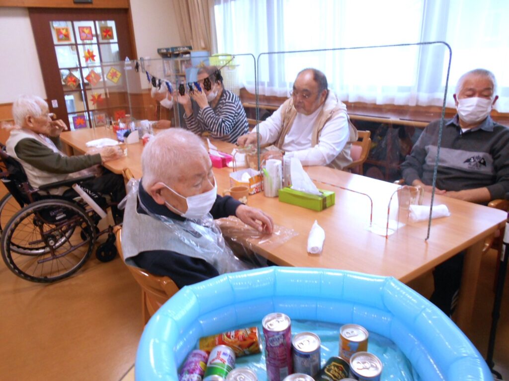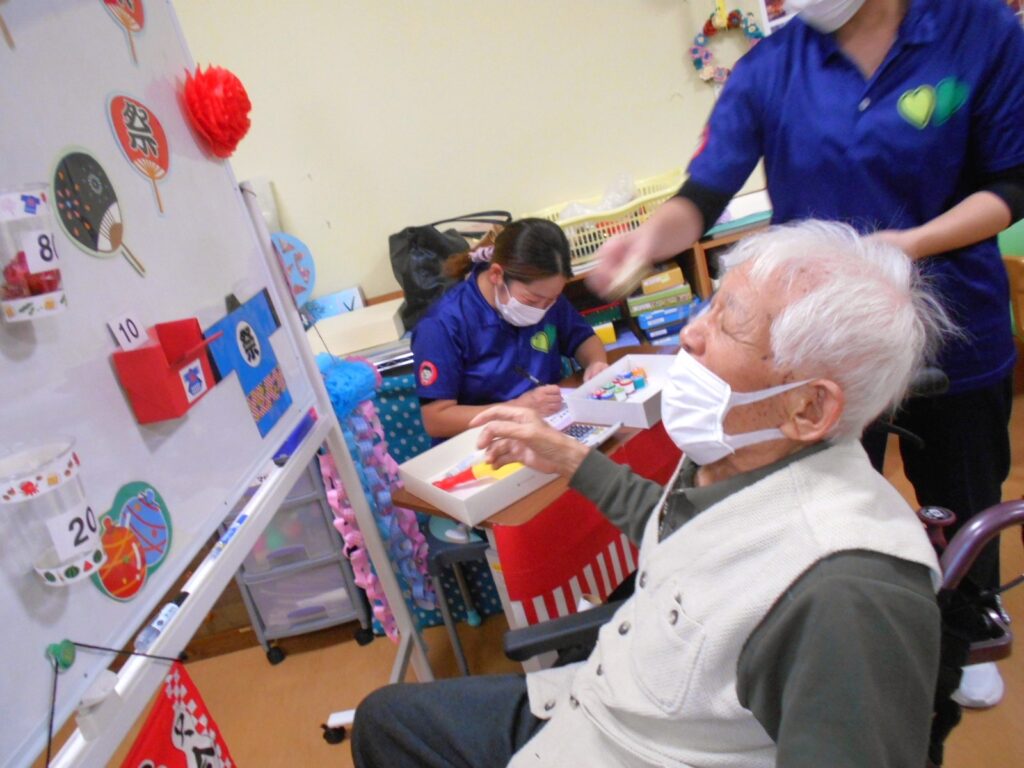 10月22日(水)に秋祭りを行いました。昼食は炊き込みご飯のお稲荷さんやたこ焼き・ポテト・フランクフルトに豚汁など盛りだくさんでしたが皆様美味しそうに召し上がっておられました。午後からは、点数の付いたカップをめがけお手玉を投げるカップインというゲームと宝釣りゲームを行いました。カップインでは100点に入ると歓声が上がり大盛り上がりでした。一日を通して皆様に喜んで頂き、うれしく思います。