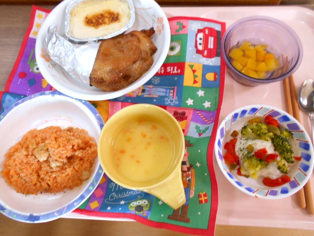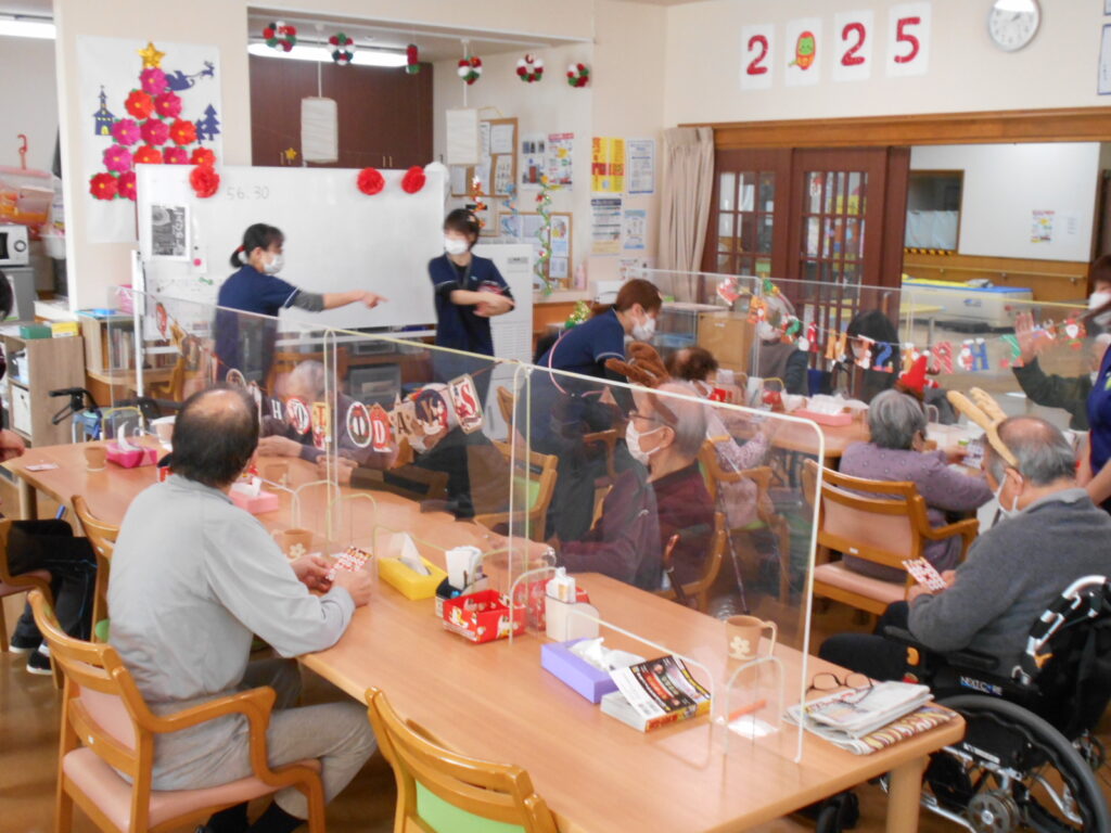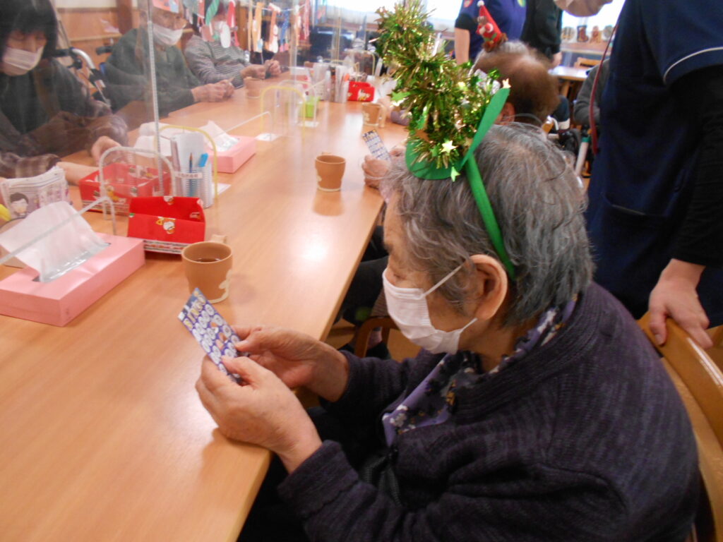 12月20日通所リハビリでは、一足先にクリスマス会を行いました。昼はクリスマス特別メニューを召し上がって頂き、午後からはビンゴゲームを行いました。皆様♡ハラハラ♡ドキドキ♡しながらビンゴ カードの数字をあけていました。“一日通して楽しかった♪”と喜んで頂けました。