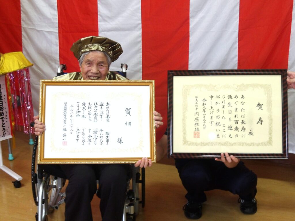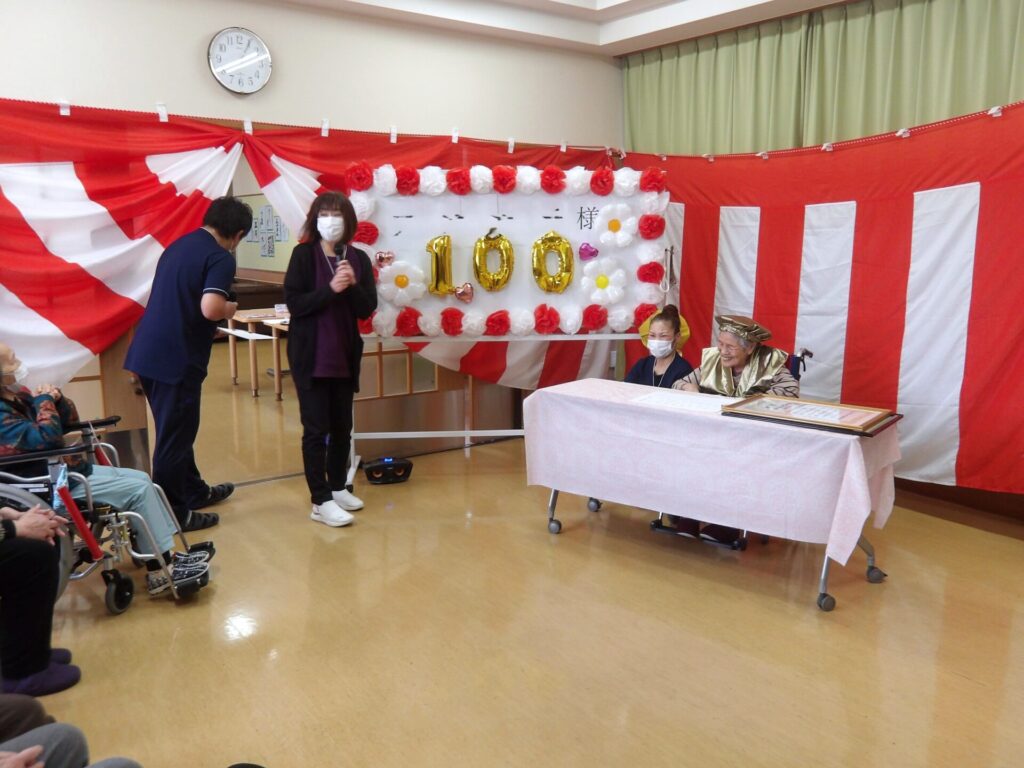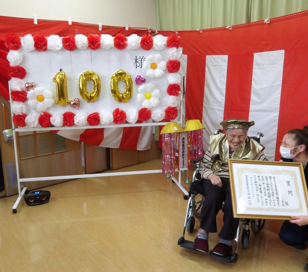100歳を迎えたお客様のお祝いを行いました。