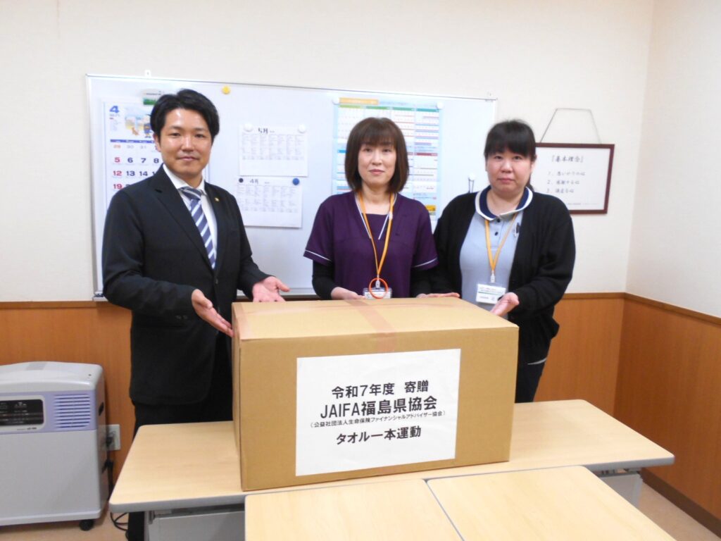 4月21日、JAIFA様(公益社団法人 生命保険ファイナンシャルアドバイザー協会様)より、タオル一本運動を通して集まったタオルをご寄付して頂きました。
