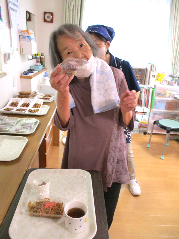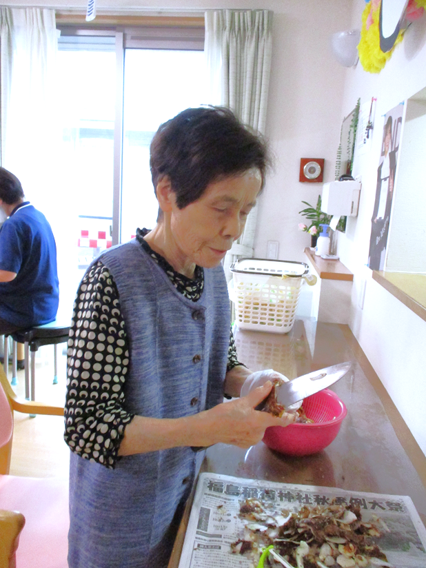 入居者様と一緒に、里芋の皮むきや野菜切りを行いました。