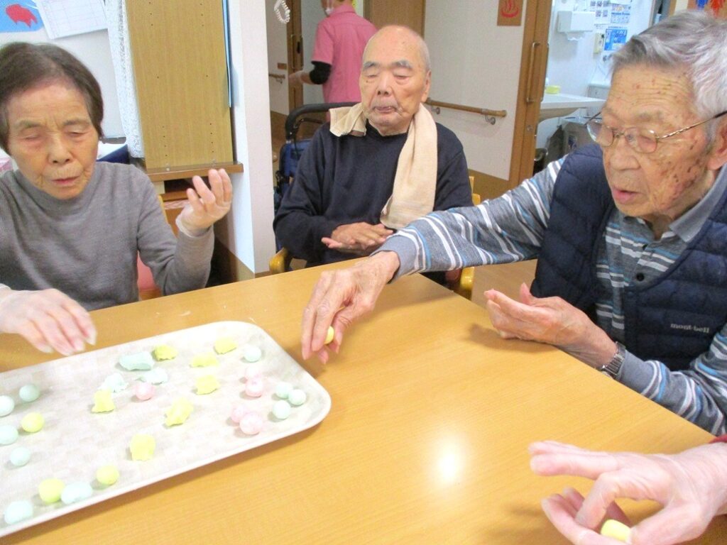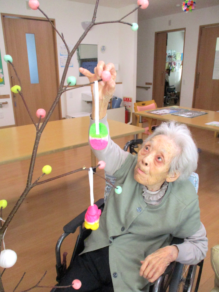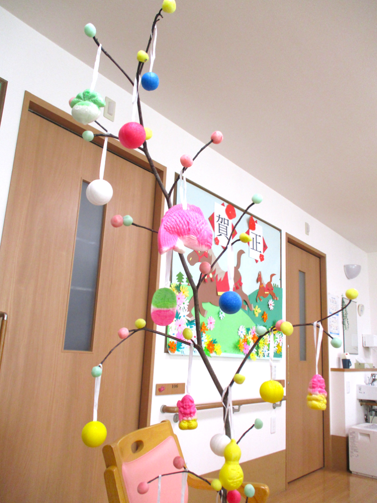 色とりどりの団子を丸め、縁起飾りと一緒にミズキの木にさしました。