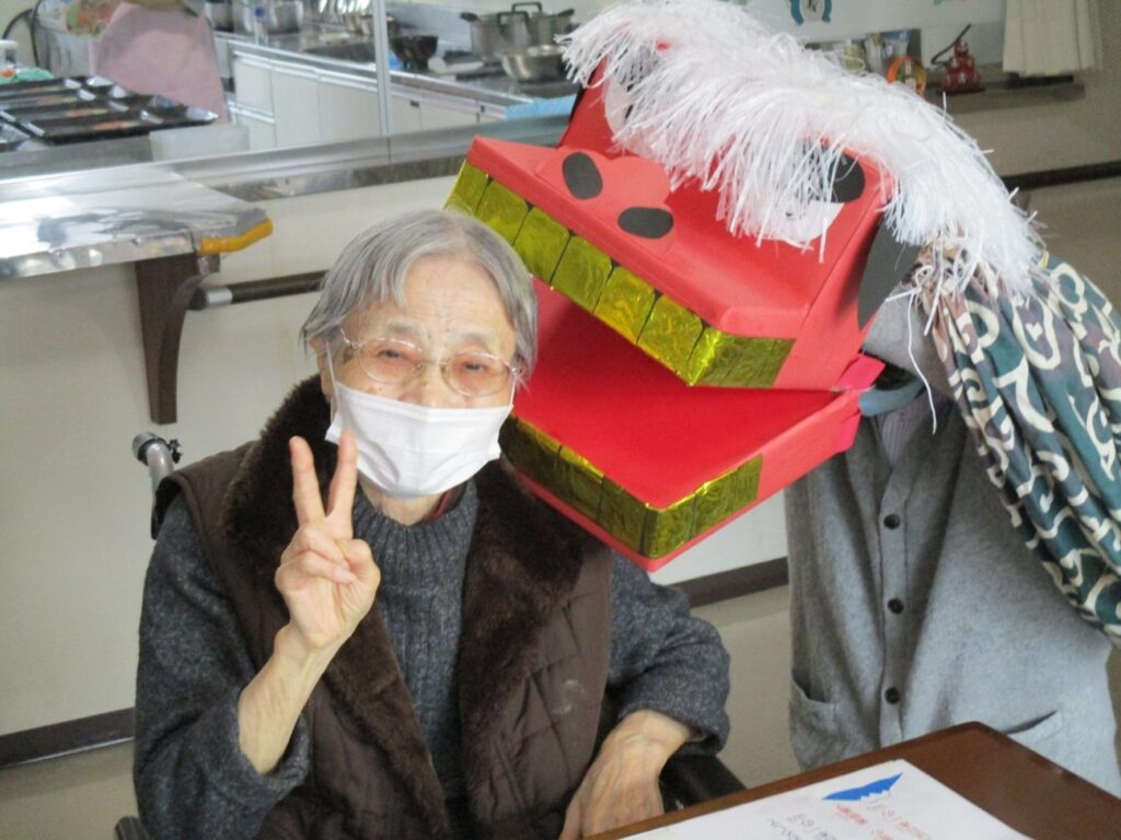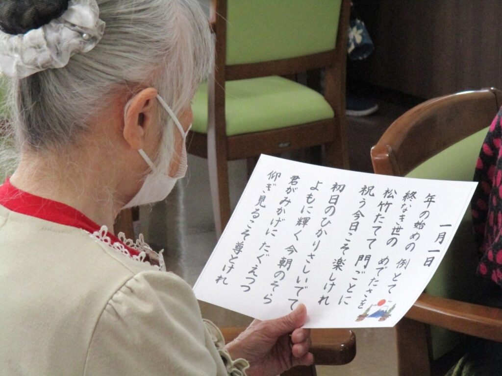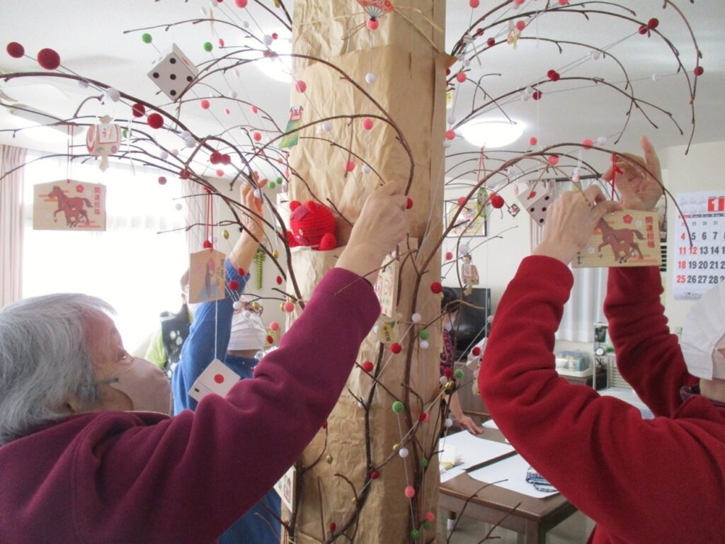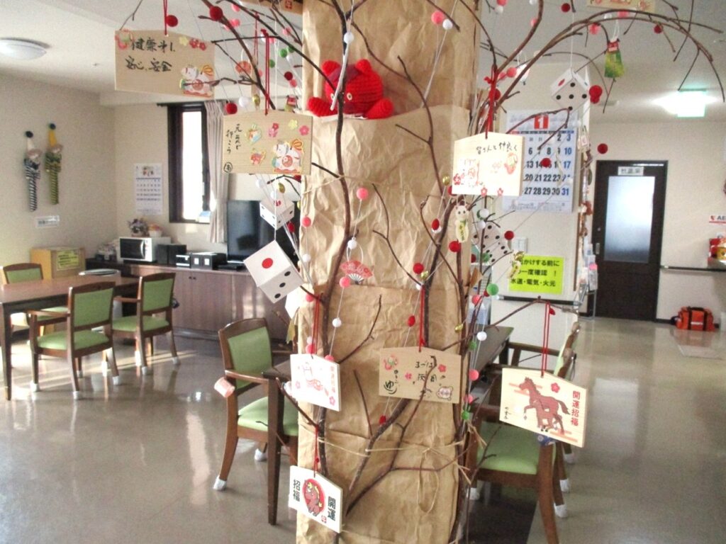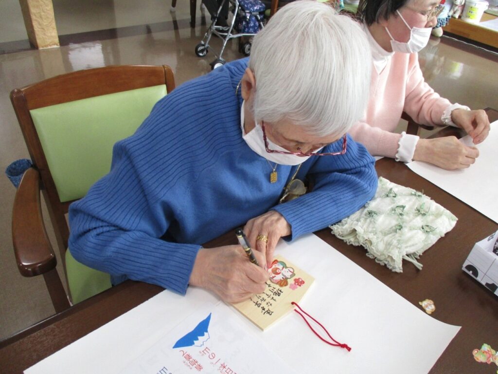 1日に入居者様と一緒にお正月の歌を歌ったり、絵馬作りやおみくじを引いたりし楽しみました。